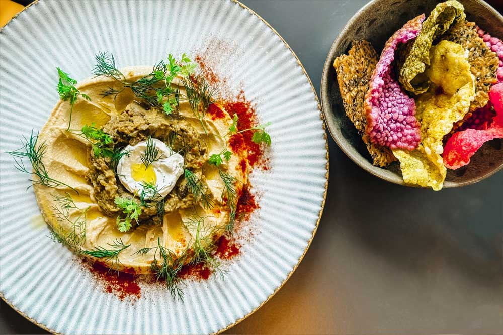 Lebanese eggplant, hummus, Labneh, multigrain crispy, homemade krupuk