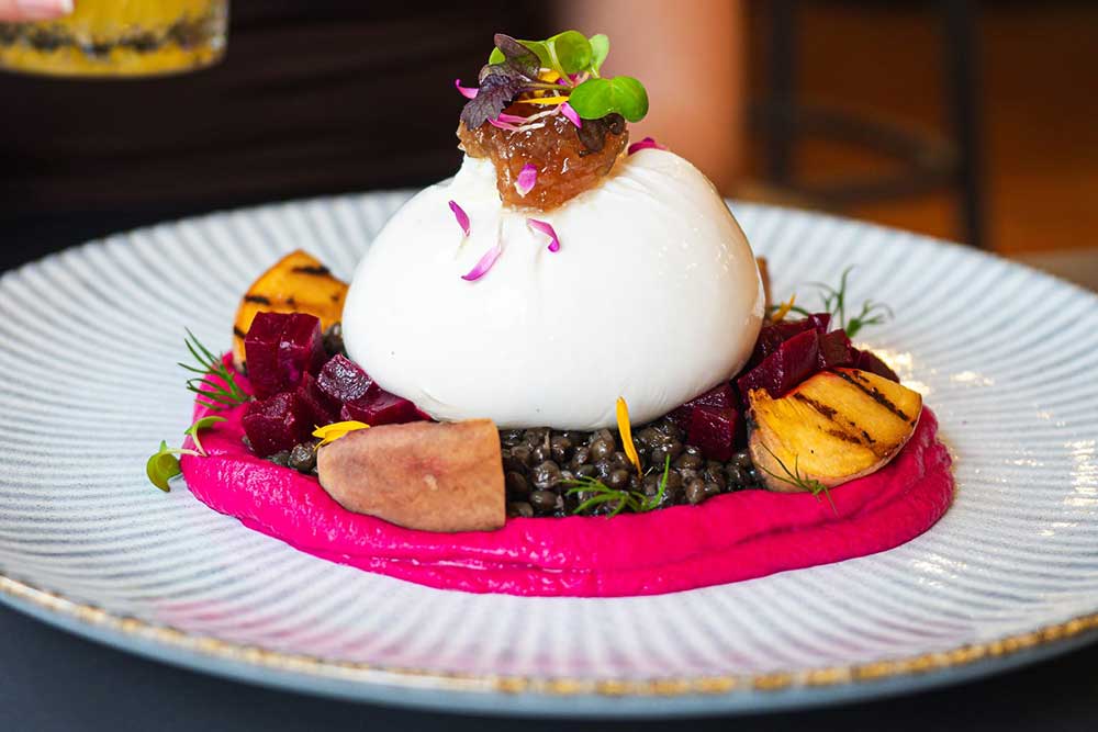 Beetroot hummus, pickled beetroot, burrata, fig chutney, kohlrabi salad, hazelnut