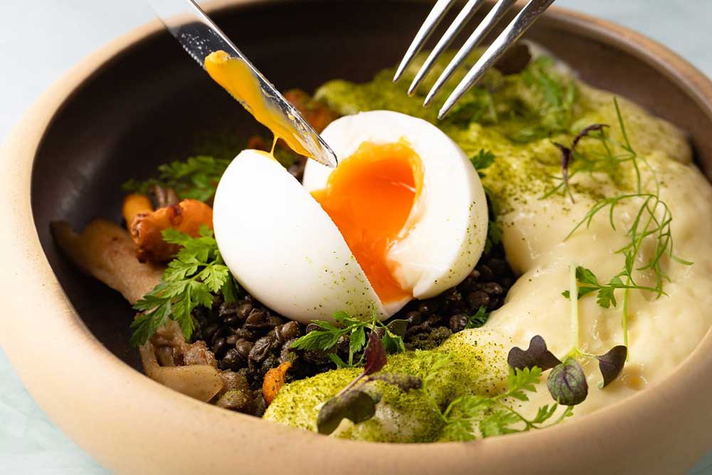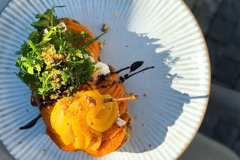 Roasted pumpkin, baba ganoush, poached pear, smoked cheese, egg 62°, walnuts, pumpkin seeds, herbs