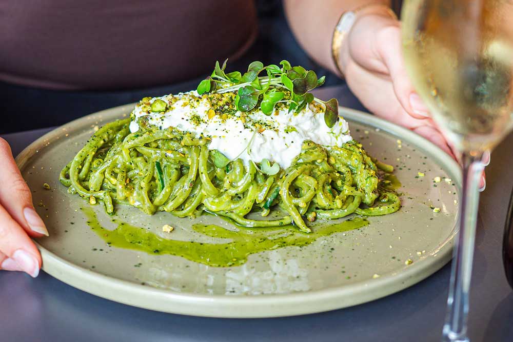 fried zucchini balls, pepper ragout, beluga lentils and labneh