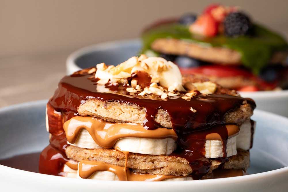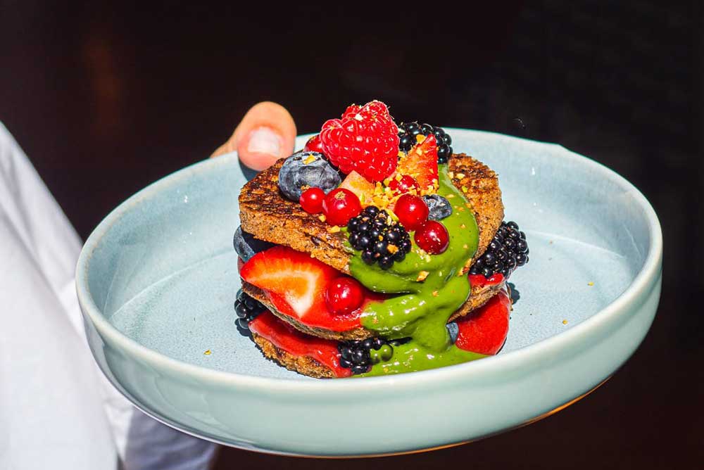 free – from pancakes, homemade strawberry jam, fresh berries, vegan matcha spread, nuts and seeds