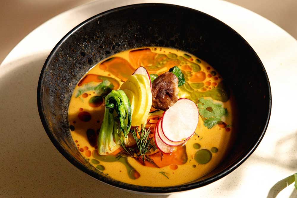 coconut milk, ramen noodles, seasonal vegetables, cilantro, Thai basil oil