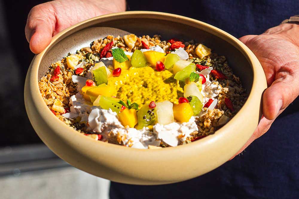 mango chia puding, pandan – coconut overnight oats, fresh tropical fruits, homemade granola, nuts and seeds, supergrains, goji